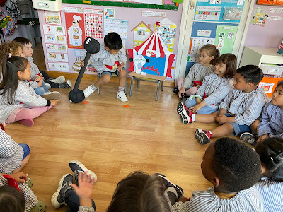 Avui el Joel ens ha explicat el forçut! Ens ha portat una pesa i l’escenari per explicar-nos la feina que fa dins l’espectacle. També ens ha fet una petita demostració de força! Gràcies!